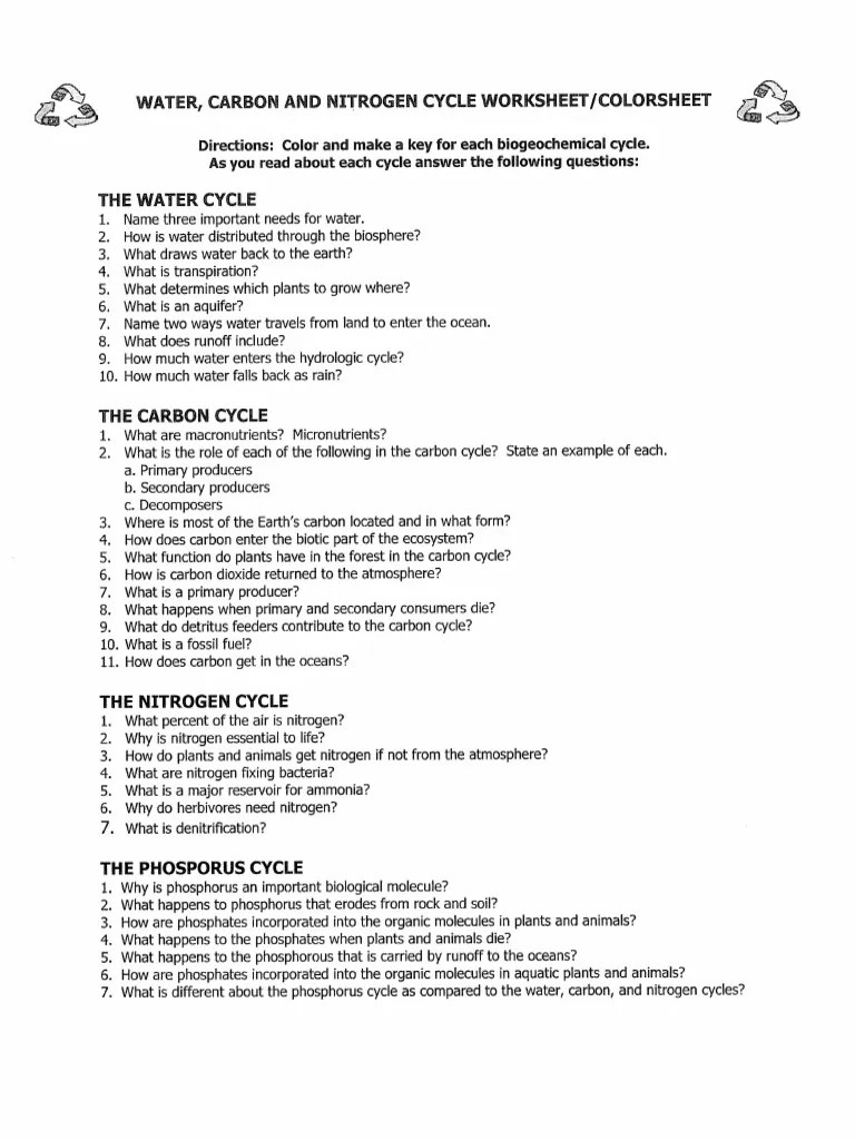 Only special bacteria can directly use nitrogen in our atmosphere and . Answers to water, carbon and nitrogen cycle worksheet. Learn vocabulary, terms, and more with flashcards, games, and other study tools. Students can use their notes and . Things, and explain how the nitrogen and carbon cycles contribute to the usable supplies of . What is different about the phosphorus cycle as compared to the water, carbon, and nitrogen cycles? Draw a simple diagram of the carbon cycle using the words in the text box above. Start studying water, carbon, and nitrogen cycle worksheet/colorsheet. Carbon dioxide, but there are now fewer trees to capture the carbon dioxide and continue the cycle. Browse nitrogen and carbon cycle resources on teachers pay teachers, a marketplace trusted by millions of teachers for original . Video and question sheet for carbon and nitrogen cycle. Included in this purchase are 5 worksheets covering the water, carbon, nitrogen, and phosphorus cycles. • water is important in photosynthesis, digestion, and cellular respiration.